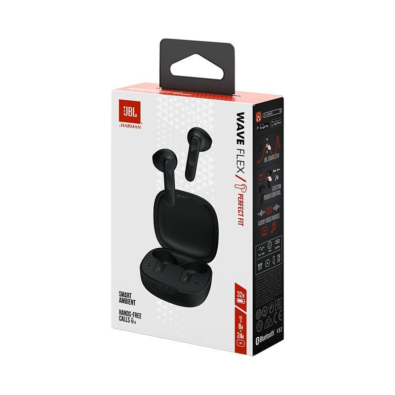 Écouteurs Sans Fil JBL Wave Flex – Connectivité: Bluetooth 5.2 – Autonomie de batterie: Jusqu’à 32 heures (8 h pour les écouteurs + 24 h avec boitier de charge) – Temps de Charge: 2 heures – Recharge rapide (5 min = 1 h de lecture – Controle tactile – Bouton multifonction TalkThru – Ambiant Aware: Restez conscient de votre environnement – Appels mains-libres – Son JBL Deep Bass – Microphone intégré – Haut-parleurs de 12mm – Résistant à l’eau: IP54 – Couleur: noir – Garantie: 1an
